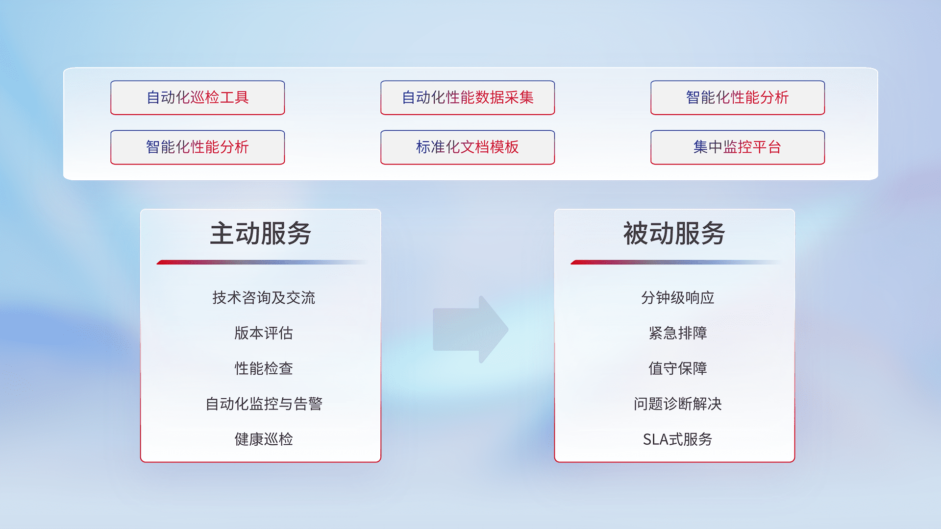 智能化工具和标准化文档,,保障服务质量,,提供主动服务(包含技术咨询、、版本评估、、、性能检查、、、自动化监控与告警、、、健康巡检)和被动服务包含(分钟级响应、、、紧急排障、、、值守保障、、、、问题诊断解决、、、、SLA服务)。。。。