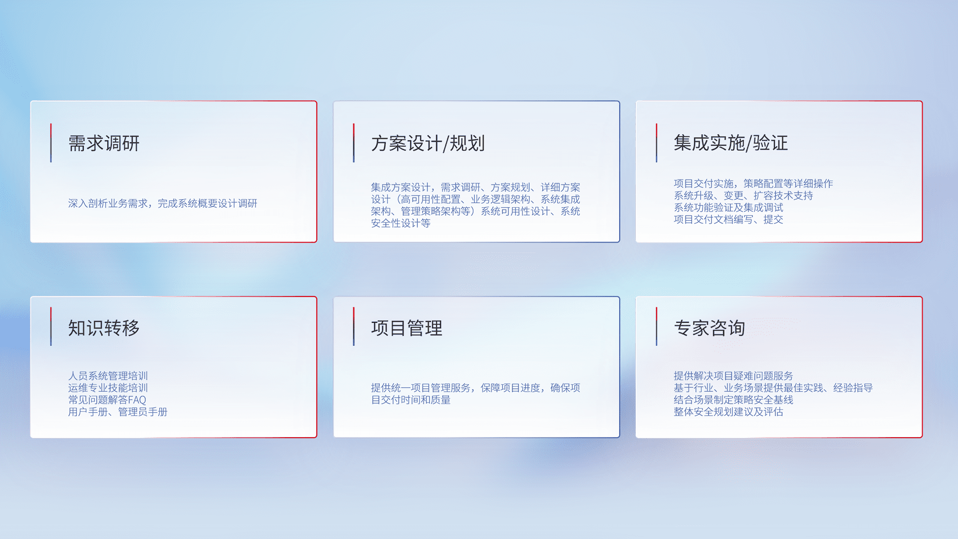 针对客户行业特性,,,将宏观的安全战略和需求,,,,通过专业的交付服务,,,实现项目落地,,,,为客户提供标准规范的集成交付服务。。。