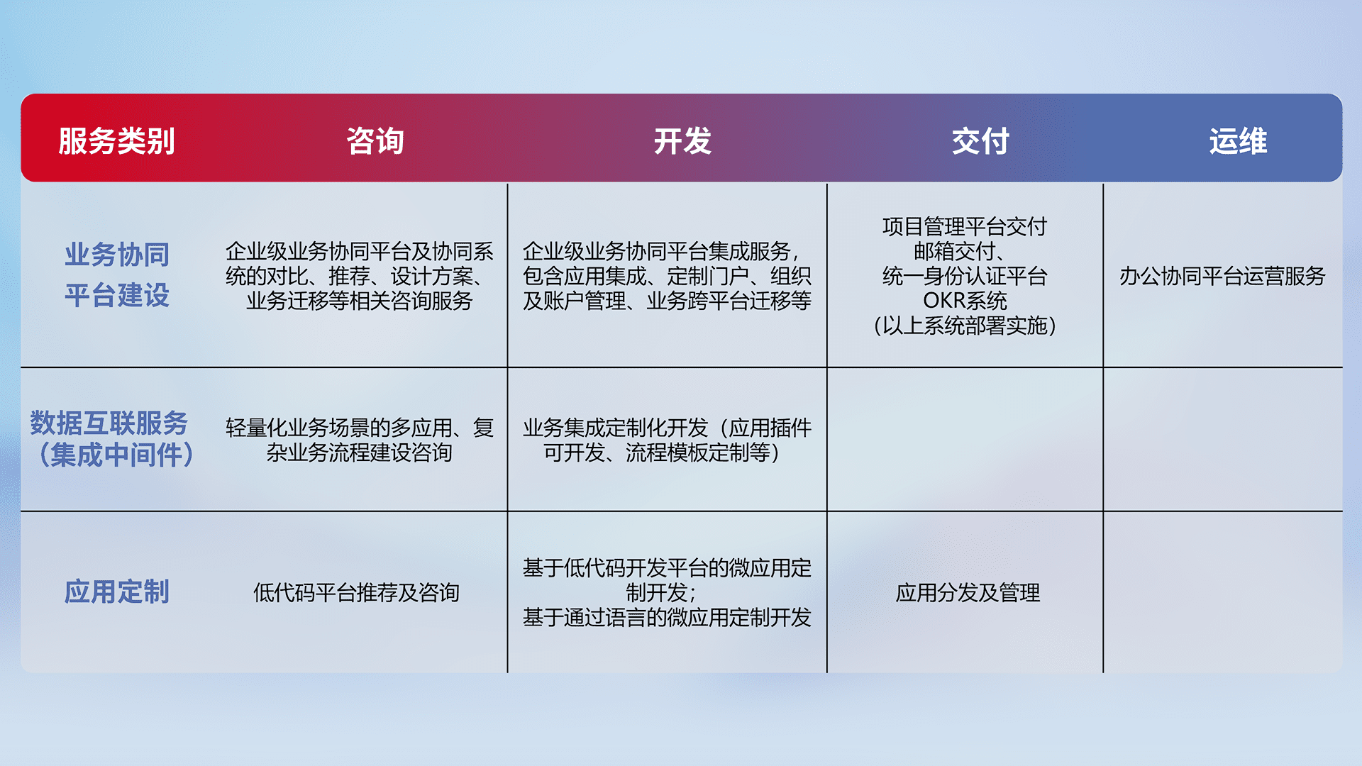 针对钉钉、、、企微、、、IDaas等平台级产品提供产品的规划、、、方案、、、、交付、、、、定制化开发等服务,,,实现如统一协同办公、、、、智能客户服务、、、、混合会议管理、、、、智能数据查询、、、、等业务场景,,,,实现数字化转型。。。。